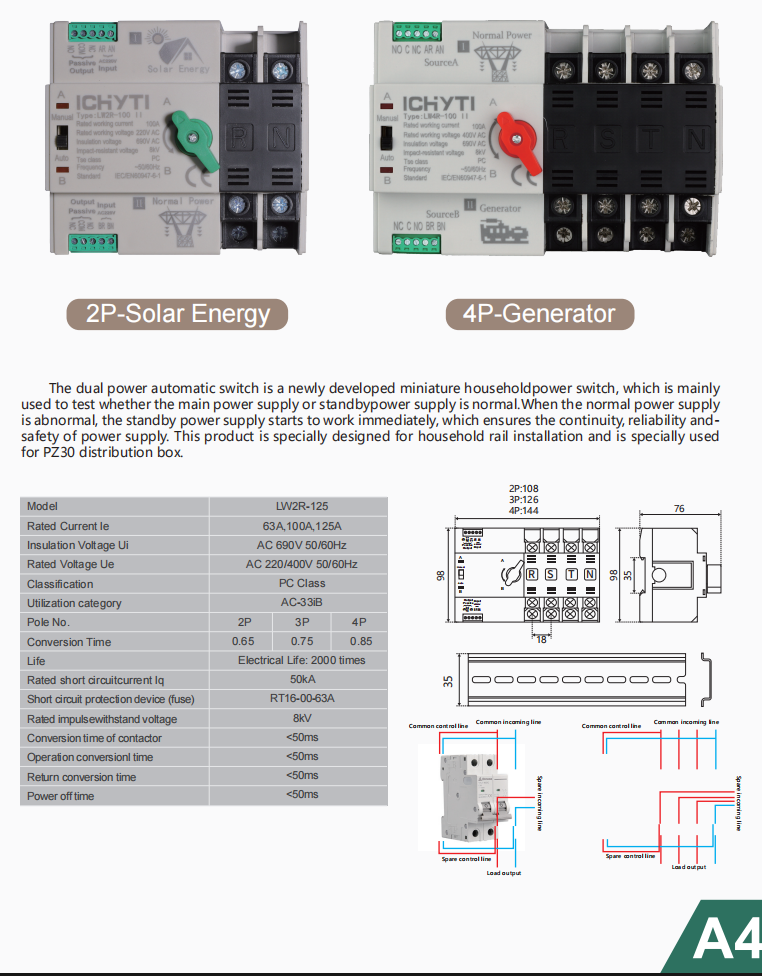Подвійна потужність ATS - це складний електричний пристрій, розроблений для управління двома чіткими джерелами живлення з великою точністю. Основна його функція полягає у виявленні стану первинного джерела живлення миттєво. Це може бути або система сонячної енергії, яка використовує енергію сонця, або корисна сітка. Коли первинне джерело не відповідає необхідним потребам електроенергії, можливо, через низьке сонячне світло для сонячних систем або відключень сітки, АТС виникає в дію. Без будь -якого втручання людини воно плавно переходить на вторинне джерело живлення, наприклад, генератор резервного копіювання або, в деяких випадках, повертаючись до сітки, якщо сонячна енергія недостатня. Цей автоматичний механізм комутації є ключовим фактором для забезпечення постійного джерела живлення, що має вирішальне значення як для житлових, так і для комерційних програм.